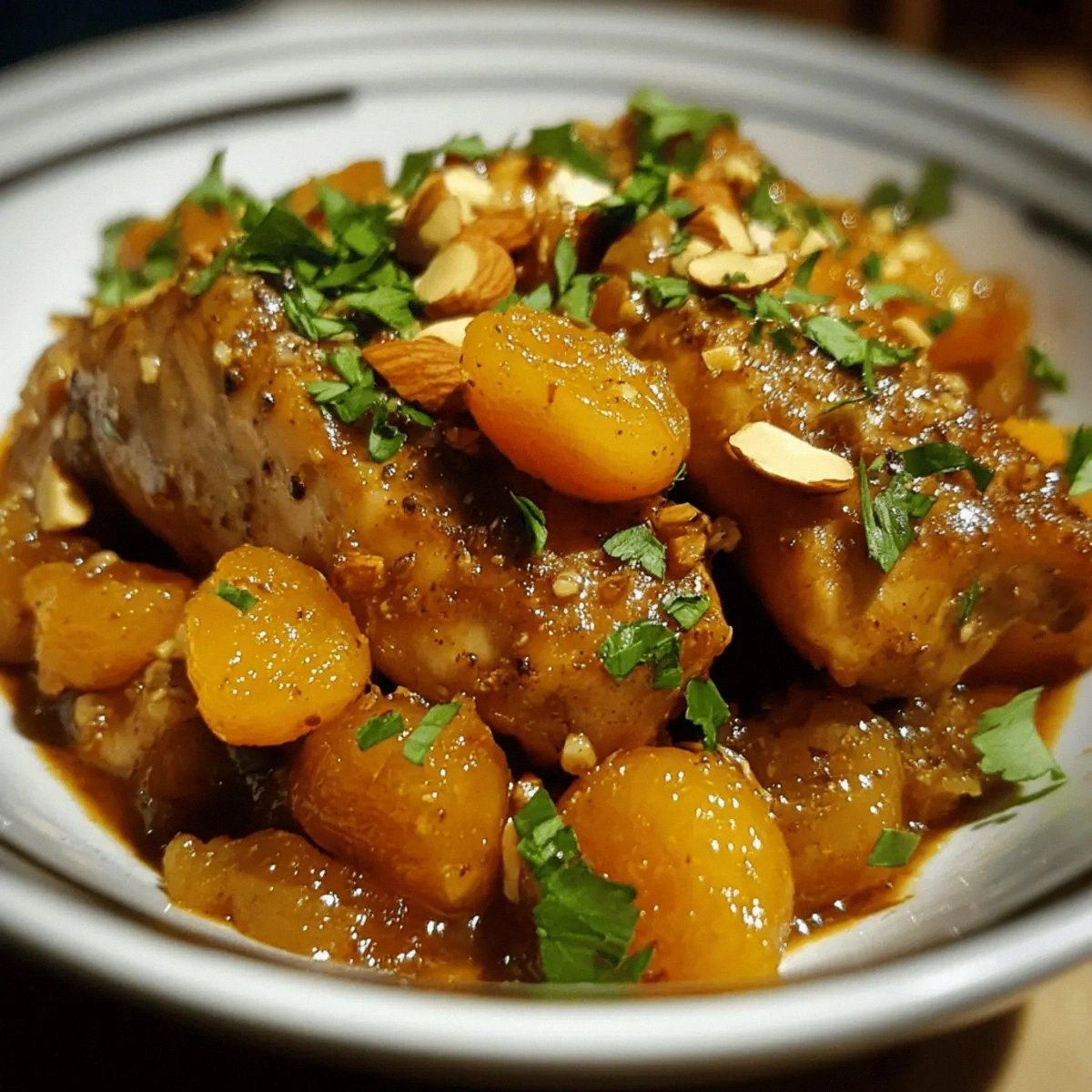 Picture yourself pulling this dish out of the oven, the kitchen smelling like a blend of citrus, honey, and warm spices. The golden crust on the chicken is not just a visual treat; it’s a textural contrast that gives a satisfying snap before the tender interior gives way to a melt‑in‑your‑mouth softness. The apricots, half‑dried, release a syrupy sweetness that coats the meat like velvet, while the toasted almonds add a nutty crunch that plays against the silky sauce. The final flourish of fresh cilantro provides a bright, herbal finish that cuts through the richness and leaves the palate refreshed. If you’ve ever struggled with a dish that feels too one‑dimensional, this is hands down the best version you’ll ever make at home.