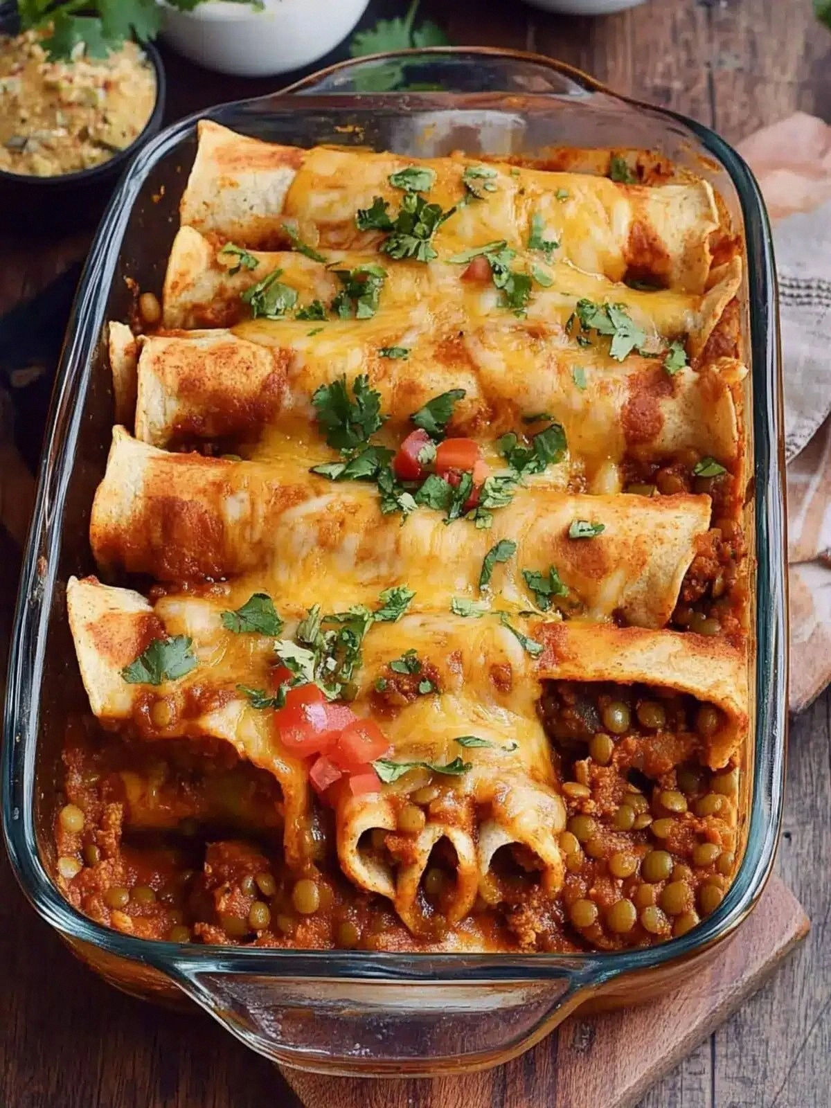 - Step 4: Assemble. Spoon about 1/4 cup of the lentil filling onto the center of each tortilla. Sprinkle a pinch of sunflower seeds on top for that extra crunch. Fold the sides in and roll tightly, ensuring the filling is sealed inside. Place the rolled enchiladas seam‑side down in a baking dish, arranging them in a single layer. If you’re using a gluten‑free flour, you can lightly dust the baking dish with it to prevent sticking.